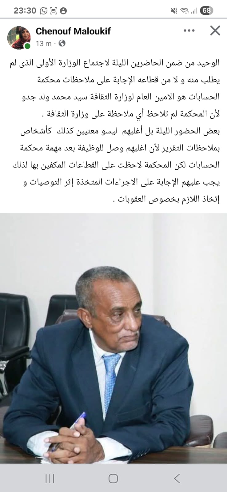 الوحيد من ضمن الحاضرين الليلة لاجتماع الوزارة الأولى الذى لم يطلب منه و لا من قطاعه الإجابة على ملاحظات محكمة الحسابات هو الامين العام لوزارة الثقافة سيد محمد ولد جدو لأن المحكمة لم تلاحظ أي ملاحظة على وزارة الثقافة .