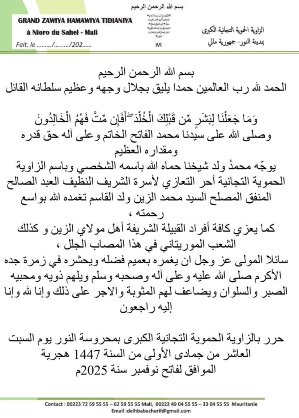 يوجّه محمدُ ولد شيخنا حماه اللّٰه باسمه الشخصي وباسم الزاوية الحموية التجانية أحر التعازي لأسرة الشريف النظيف العبد الصالح المنفق المصلح السيد محمد الزين ولد القاسم تغمده اللّٰه بواسع رحمته ،