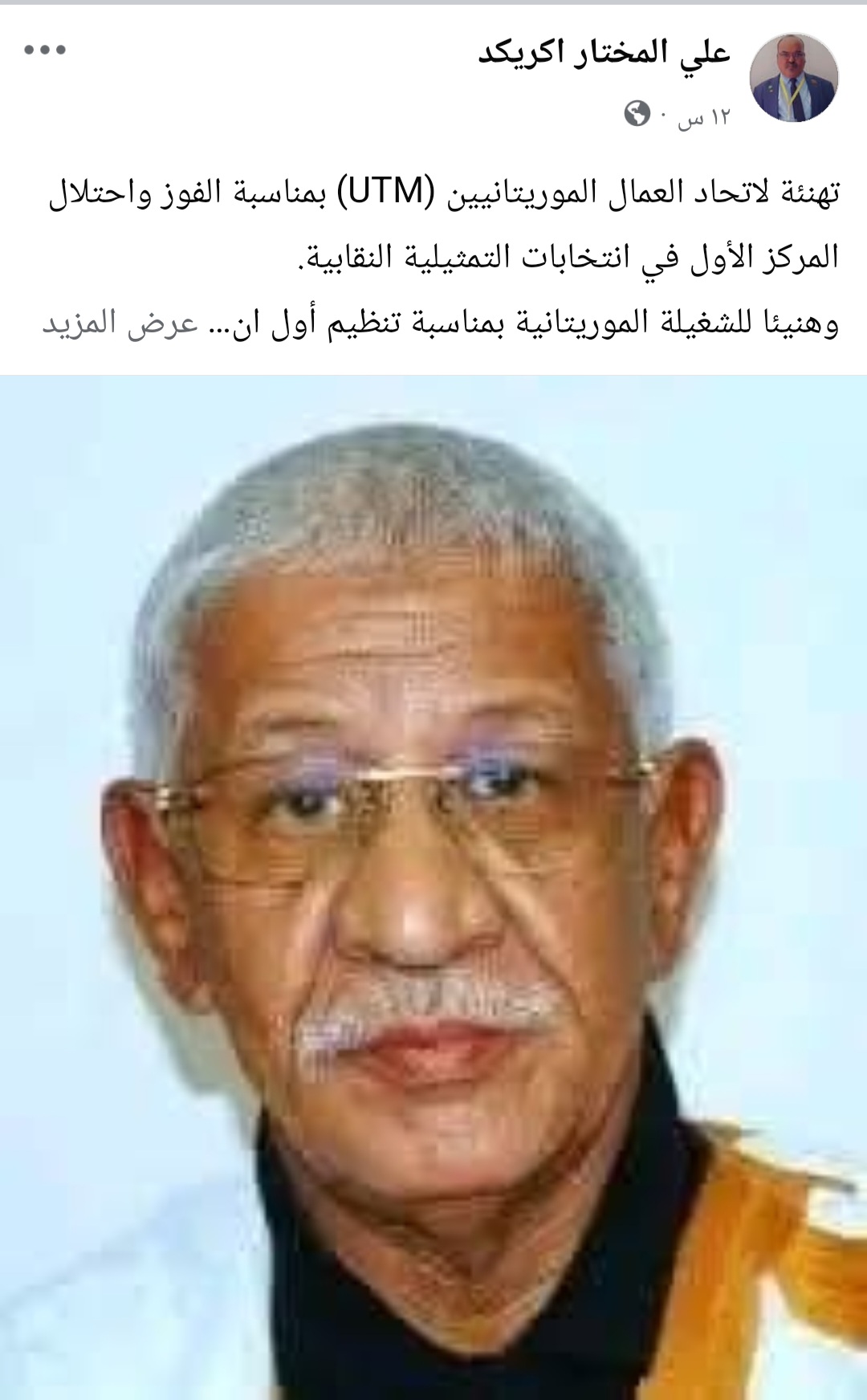 تهنئة لاتحاد العمال الموريتانيين (UTM) بمناسبة الفوز واحتلال المركز الأول في انتخابات التمثيلية النقابية.