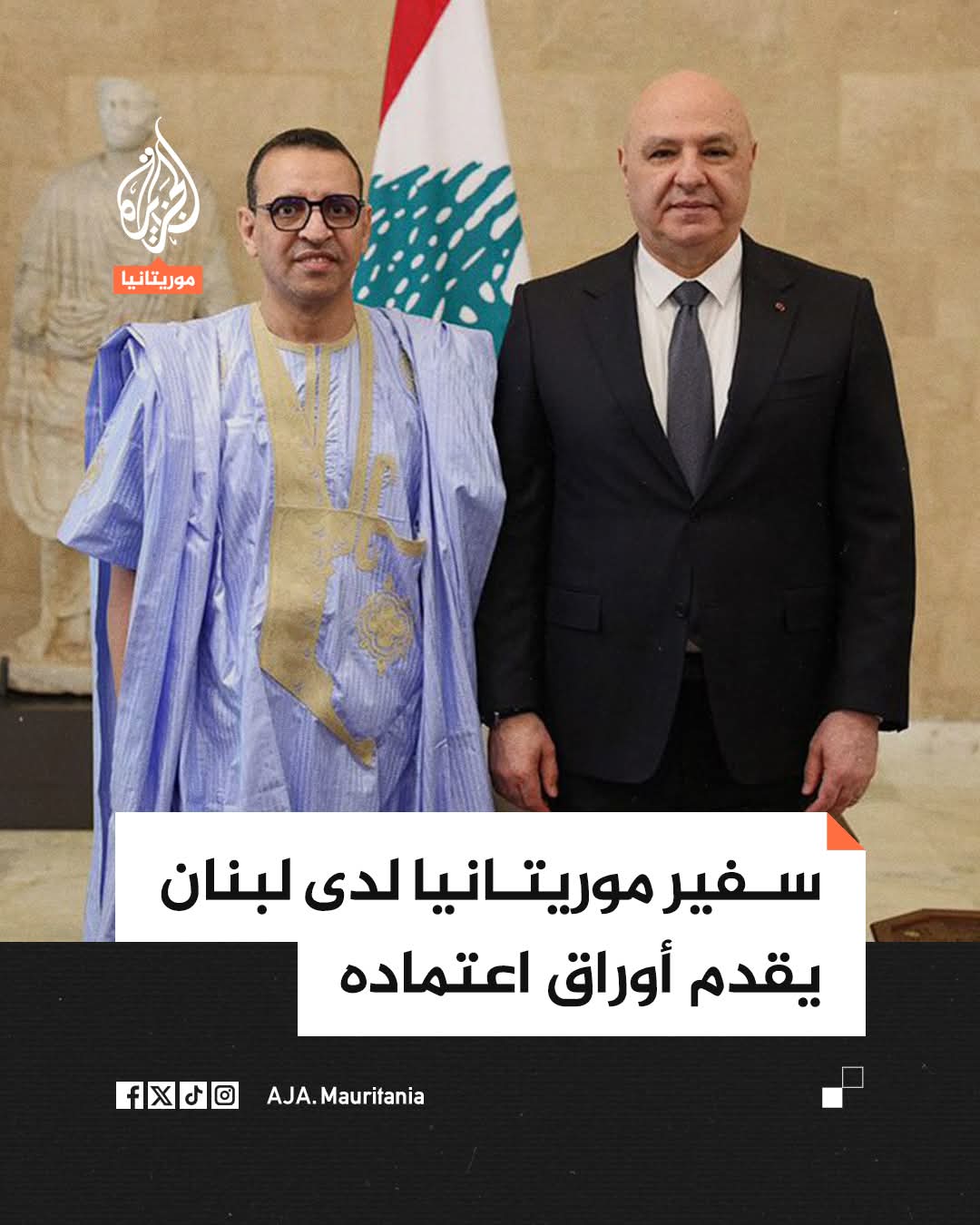 قدم السفير الموريتاني الطالب المختار الشيخ محمد المجتبى أوراق اعتماده للرئيس اللبناني جوزيف عون، بصفته سفيرًا فوق العادة وكامل السلطة لموريتانيا لدى لبنان، مقيمًا بدمشق.