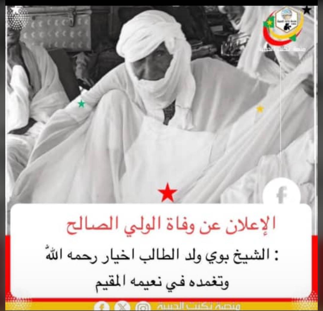أُعلن مساء الثلاثاء عن وفاة الشيخ بوي ولد الطالب أخيار في المستشفى العسكري بالعاصمة نواكشوط، وذلك بعد تعرضه لوعكة صحية استدعت تدخلاً طبياً عاجلاً، وفق ما أكدته مصادر عائلية.