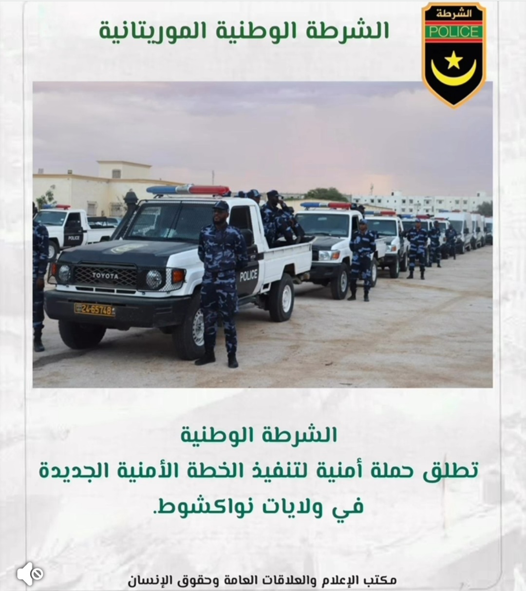 تطبيقا للخطة الأمنية للمديرية العامة للأمن الوطني تم ليلة البارحة إطلاق حملة أمنية تستهدف دعم مفوضيات الشرطة في ولايات نواكشوط الغربية والشمالية والجنوبية من أجل تطبيق الخطة الأمنية الجديدة الساعية لسد الاختلالات الأمنية الملاحظة.