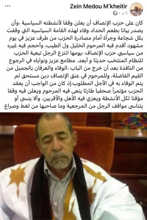 كان على حزب الإنصاف أن يعلن وقفا لأنشطته السياسية ،وأن يصدر بيانا بطعم الحداد وفاء لهذه القامة السياسيه التي وقفت بكل شجاعة وجرأة أمام مصادرة الحزب من طرف عزيز في يوم مشهود أقدم فيه المرحوم الخليل ول الطيب، وأحجم فيه غيره من سياسيي حزب الإنصاف ،يومها انتزع الرجل تبعية الحزب للنظام المنتخب حديثا و أبعد. مطامع عزيز ونواياه في الرجوع من النافذة بعد أن خرج من الباب ،الوفاء والعرفان بالجميل من القيم الفاضلة، وللمرحوم في عنق الإنصاف دين مستحق لم يتم الوفاء به في الأجل المطلوب،إذ كان من الواجب أن يعقد الحزب مؤتمراً صحفيا طارئا ينعى فيه المرحوم ويعلن فيه وقفا مؤقتا لكل الأنشطة ويعزي فيه الأهل والأقربين، وألا ينسى أو يتناسى مواقف الرجل من المرجعية وما صاحبها من لغط وصراع.