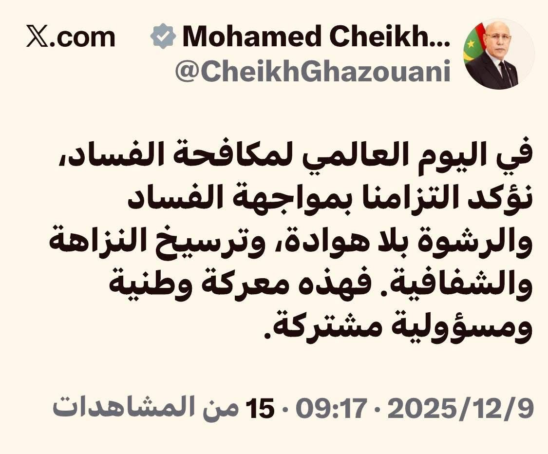 جاء المنشور بمناسبة تخليد اليوم العالمي لمكافحة الفساد، حيث أكد غزواني مضيه في ترسيخ النزاهة والشفافية.