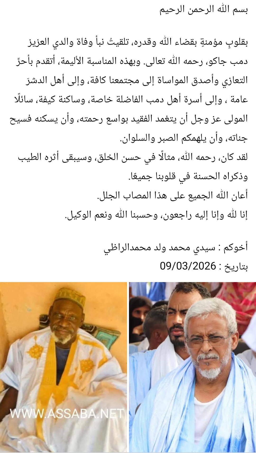 بقلوبٍ مؤمنةٍ بقضاء الله وقدره، تلقيتُ نبأ وفاة والدي العزيز دمب جاكو، رحمه الله تعالى. وبهذه المناسبة الأليمة، أتقدم بأحرِّ التعازي وأصدق المواساة إلى مجتمعنا كافة، وإلى أهل الدشرَ عامة ، وإلى أسرة أهل دمب الفاضلة خاصة، وساكنة كيفة، سائلًا المولى عز وجل أن يتغمد الفقيد بواسع رحمته، وأن يسكنه فسيح جناته، وأن يلهمكم الصبر والسلوان.