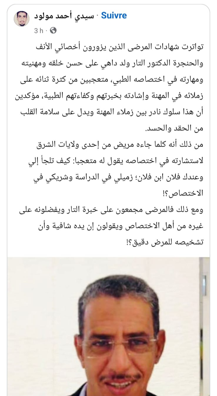 تواترت شهادات المرضى الذين يزورون أخصائي الأنف والحنجرة الدكتور التار ولد داهي على حسن خلقه ومهنيته ومهارته في اختصاصه الطبي، متعجبين من كثرة ثنائه على زملائه في المهنة وإشادته بخبرتهم وكفاءتهم الطبية، مؤكدين أن هذا سلوك نادر بين زملاء المهنة ويدل على سلامة القلب من الحقد والحسد.