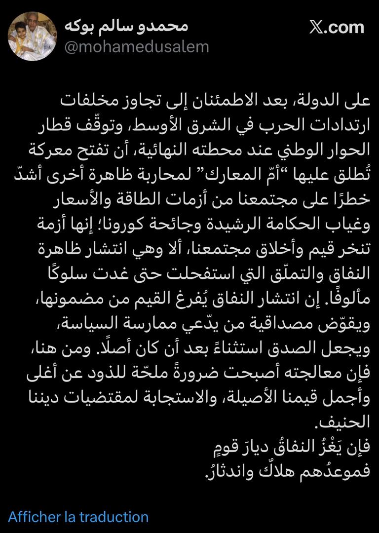 على الدولة، بعد الاطمئنان إلى تجاوز مخلفات ارتدادات الحرب في الشرق الأوسط، وتوقّف قطار الحوار الوطني عند محطته النهائية، أن تفتح معركة تُطلق عليها “أمّ المعارك” لمحاربة ظاهرة أخرى أشدّ خطرًا على مجتمعنا من أزمات الطاقة والأسعار وغياب الحكامة الرشيدة وجائحة كورونا؛ إنها أزمة تنخر قيم وأخلاق مجتمعنا، ألا وهي انتشار ظاهرة النفاق والتملّق التي استفحلت حتى غدت سلوكًا مألوفًا. إن انتشار النفاق يُفرغ القيم من مضمونها، ويقوّض مصداقية من يدّعي ممارسة السياسة، ويجعل الصدق استثناءً بعد أن كان أصلًا. ومن هنا، فإن معالجته أصبحت ضرورةً ملحّة للذود عن أغلى وأجمل قيمنا الأصيلة، والاستجابة لمقتضيات ديننا الحنيف.