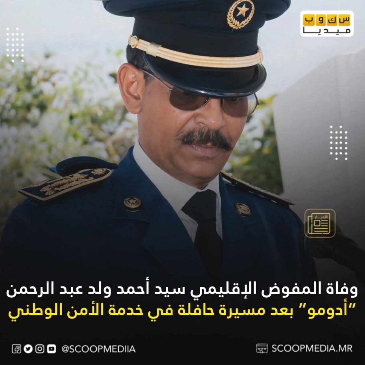 أُعلن صباح اليوم السبت، في مستشفى القلب بنواكشوط عن وفاة المفوض الإقليمي الشهير سيد أحمد ولد عبد الرحمن ولد أحمد سيدي، الملقب بـ“أدومو”، وذلك بعد مسيرة مهنية حافلة في خدمة الأمن الوطني.