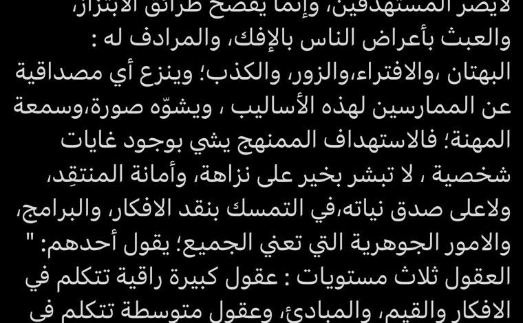 حرصُ البعض – ممن يدّعي الانتساب لمهنة الصحافة- على استهداف مكشوف لأشخاص بعينهم، لايضر المستهدَفين، وإنما يفضح طرائق الابتزاز، والعبث بأعراض الناس بالإفك، والمرادف له : البهتان ،والافتراء،والزور، والكذب؛ وينزع أي مصداقية عن الممارسين لهذه الأساليب ، ويشوّه صورة،وسمعة المهنة؛ فالاستهداف الممنهج يشي بوجود غايات شخصية ، لا تبشر بخير على نزاهة، وأمانة المنتقِد، ولاعلى صدق نياته،في التمسك بنقد الافكار، والبرامج، والامور الجوهرية التي تعني الجميع؛ يقول أحدهم: ” العقول ثلاث مستويات : عقول كبيرة راقية تتكلم في الافكار والقيم، والمبادئ، وعقول متوسطة تتكلم في الأحداث، والوقائع،وعقول صغيرة لاترى إلا الاشخاص فتنشغل بهم ذماً،ومدحاً”.ويقول زهير بن أبي سلمى: