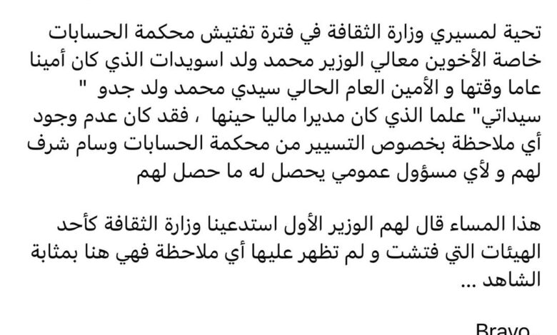 تحية لمسيري وزارة الثقافة في فترة تفتيش محكمة الحسابات خاصة الأخوين معالي الوزير محمد ولد اسويدات الذي كان أمينا عاما وقتها و الأمين العام الحالي سيدي محمد ولد جدو ” سيداتي” علما الذي كان مديرا ماليا حينها ، فقد كان عدم وجود أي ملاحظة بخصوص التسيير من محكمة الحسابات وسام شرف لهم و لأي مسؤول عمومي يحصل له ما حصل لهم