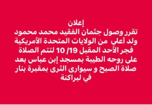 أعلن بالولايات المتحدة عن وفاة المغفور له بإذن الله تعالى محمد محمود ولد اعلي ، وتقرر وصول جثمان الراحل فجر الأحد المقبل 19 اكتوبر على أن تتم الصلاة على الجنازة في جامع بن عباس