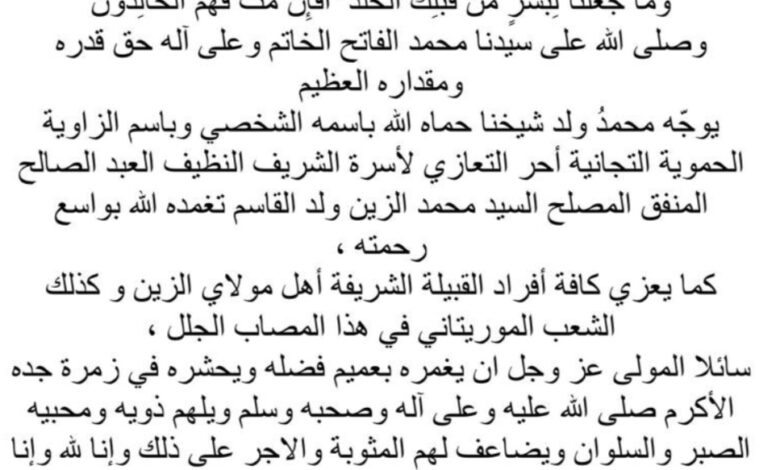 يوجّه محمدُ ولد شيخنا حماه اللّٰه باسمه الشخصي وباسم الزاوية الحموية التجانية أحر التعازي لأسرة الشريف النظيف العبد الصالح المنفق المصلح السيد محمد الزين ولد القاسم تغمده اللّٰه بواسع رحمته ،