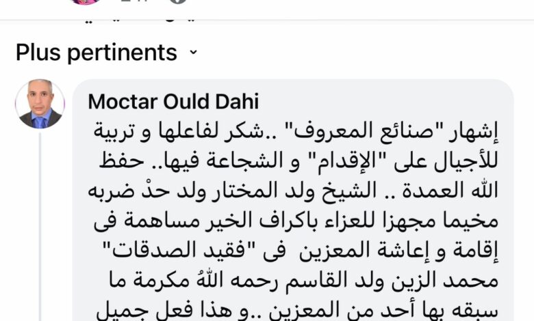 إشهار “صنائع المعروف” ..شكر لفاعلها و تربية للأجيال على “الإقدام” و الشجاعة فيها.. حفظ الله العمدة .. الشيخ ولد المختار ولد حدْ ضربه مخيما مجهزا للعزاء باكراف الخير مساهمة فى إقامة و إعاشة المعزين فى “فقيد الصدقات” محمد الزين ولد القاسم رحمه اللهُ مكرمة ما سبقه بها أحد من المعزين ..و هذا فعل جميل ومنه أجمل إهداؤه -بعد انصرام أيام التعزية- المخيم و أثاثه و مواعينه لمحظرة أهل القاسم