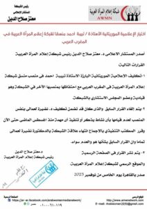 اولا ..تكليف الإعلامية الموريتانية البارزة الاستاذة تبيبة احمد فى منصب منسق شبكة إعلام المرأة العربية فى المغرب العربي مع احتفاظها بمنصبها الآخر في الشبكة وهو قيادية وعضو المجلس الاستشاري بالشبكة