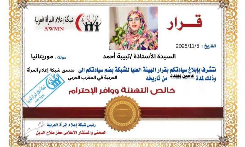 اختيار الإعلامية الموريتانية الاستاذة تبيبة احمد منسقا لشبكة إعلام المرأة العربية في المغرب العربي