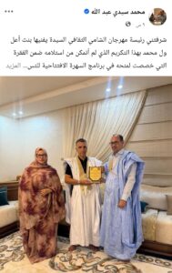 شرفتني رئيسة مهرجان الشامي الثقافي السيدة يغنيها بنت أعل ول محمد بهذا التكريم الذي لم أتمكن من استلامه ضمن الفقرة التي خصصت لمنحه في برنامج السهرة الافتتاحية للنسخة الثالثة من المهرجان .