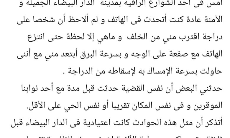 أمس فى أحد الشوارع الراقية بمدينة الدار البيضاء الجميلة و الآمنة عادة كنت أتحدث فى الهاتف و لم ألاحظ أن شخصا على دراجة اقترب مني من الخلف و ماهي إلا لحظة حتى انتزع الهاتف مع صفعة على الوجه و بسرعة البرق أبتعد مني مع أننى حاولت بسرعة الإمساك به لإسقاطه من الدراجة .