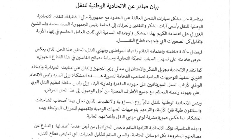 الرئيسية/Uncategorized/اتحادية النقل بموريتانيا تصدر بيانا بشأن حل أزمة الشاحنات العالقة على الحدود مع مالي Uncategorizedالأخبار اتحادية النقل بموريتانيا تصدر بيانا بشأن حل أزمة الشاحنات العالقة على الحدود مع مالي Redacteur en Chefمنذ 5 ساعات 23 Redacteur en Chefمنذ 5 ساعات 23 شاركها فيسبوك X ماسنجر ماسنجر واتساب تيلقرام