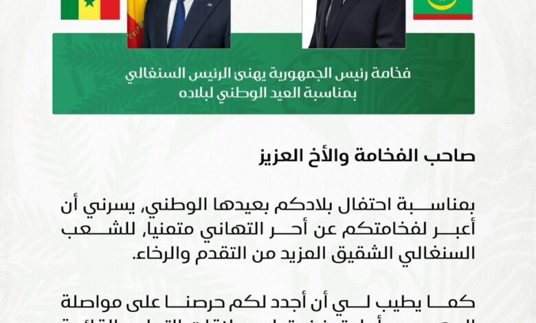 وختم الرئيس غزواني برقيته معربا عن أسمى آيات التقدير والاحترام لرئيس السنغال، مؤكدا حرص موريتانيا على تعزيز أواصر الأخوة والتعاون بين البلدين