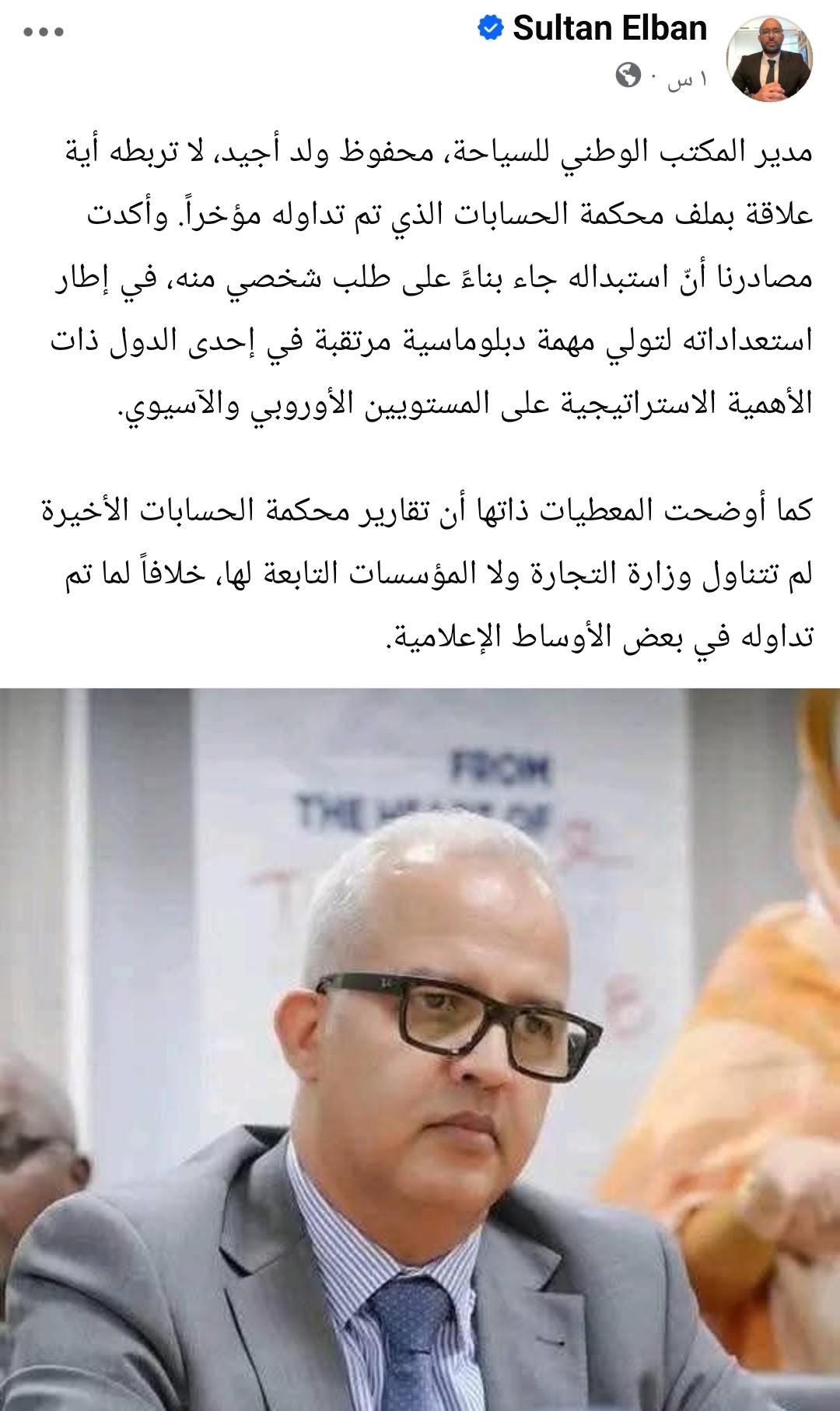 مدير المكتب الوطني للسياحة، محفوظ ولد أجيد، لا تربطه أية علاقة بملف محكمة الحسابات الذي تم تداوله مؤخراً. وأكدت مصادرنا أنّ استبداله جاء بناءً على طلب شخصي منه، في إطار استعداداته لتولي مهمة دبلوماسية مرتقبة في إحدى الدول ذات الأهمية الاستراتيجية على المستويين الأوروبي والآسيوي.