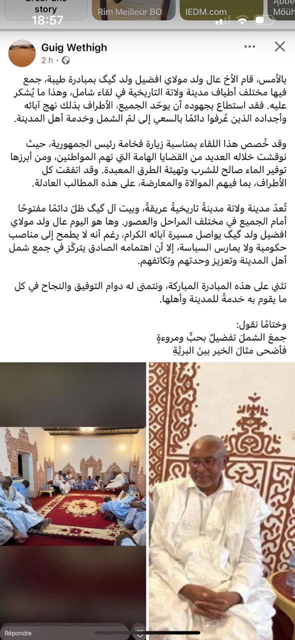 بالأمس، قام الأخ عال ولد مولاي افضيل ولد گيگ بمبادرة طيبة، جمع فيها مختلف أطياف مدينة ولاتة التاريخية في لقاء شامل، وهذا ما يُشكر عليه. فقد استطاع بجهوده أن يوحّد الجميع، الأطراف بذلك نهج آبائه وأجداده الذين عُرفوا دائمًا بالسعي إلى لمّ الشمل وخدمة أهل المدينة.