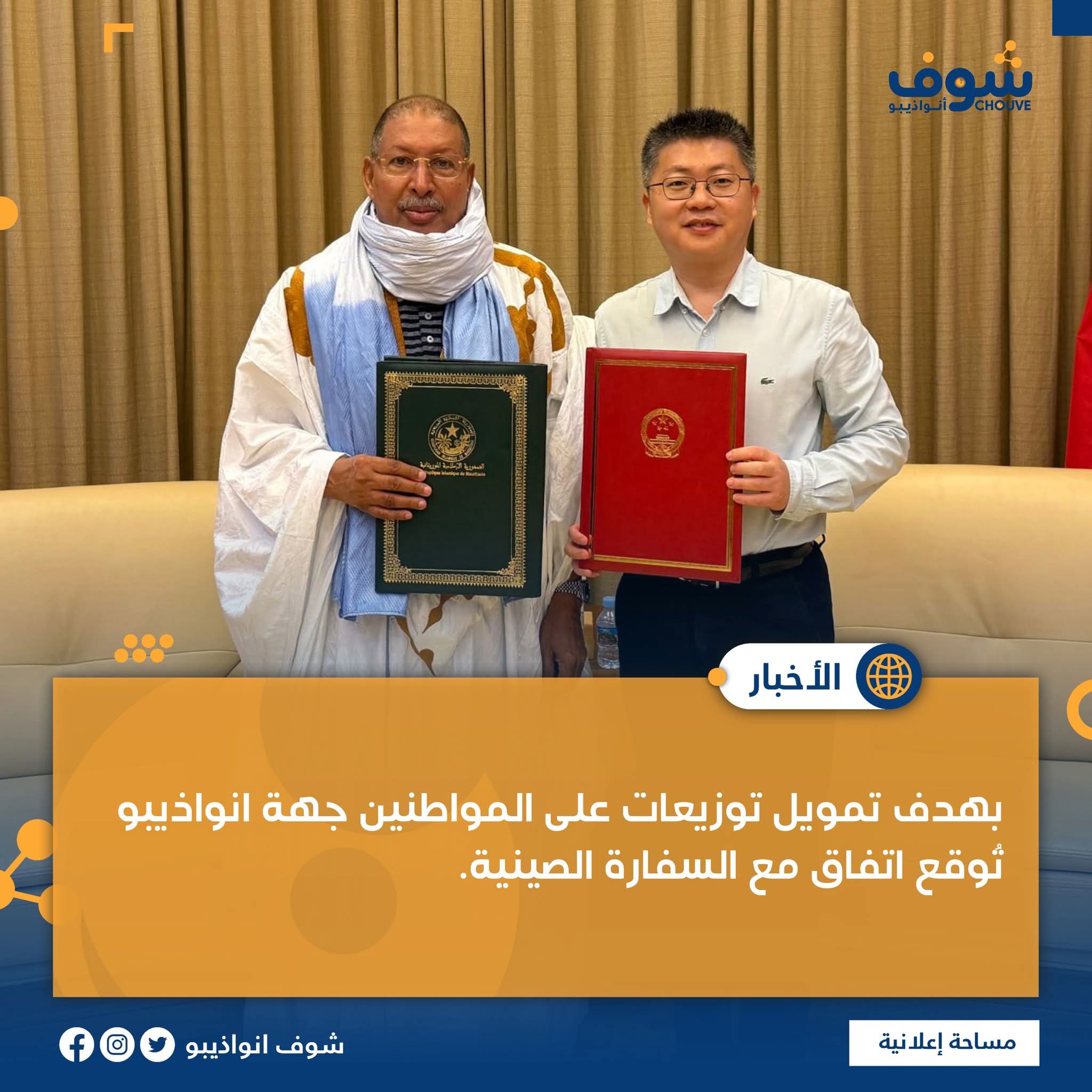 أعلنت جهة داخلت انواذيبو،عن توقيع محضر اتفاق، مع سفارة جمهورية الصين الشعبية بموريتانيا، يقضي بتمويل السفارة الصينية،لعملية توزيع كميات معتبرة من المواد الغذائية، ستتولى الجهة إيصالها لصالح عدد معتبر من الأسر الهشة في مدينة انواذيبو.